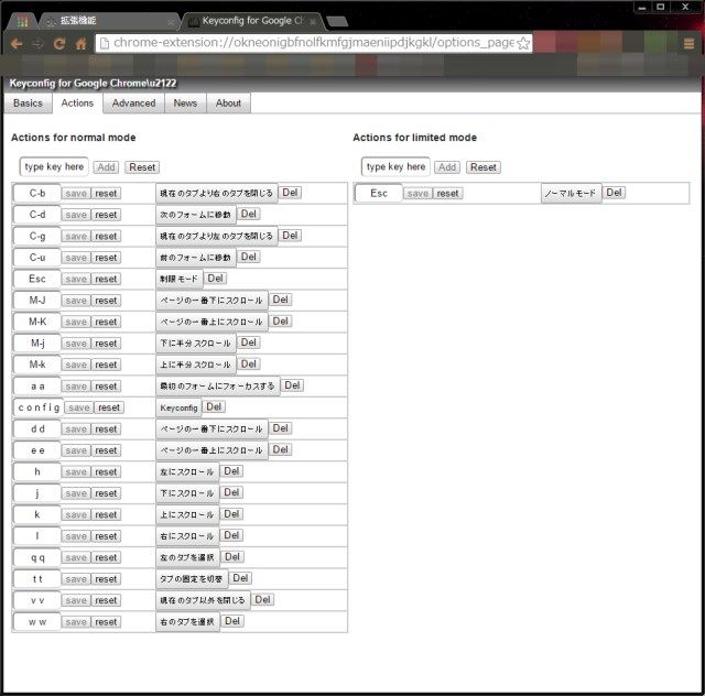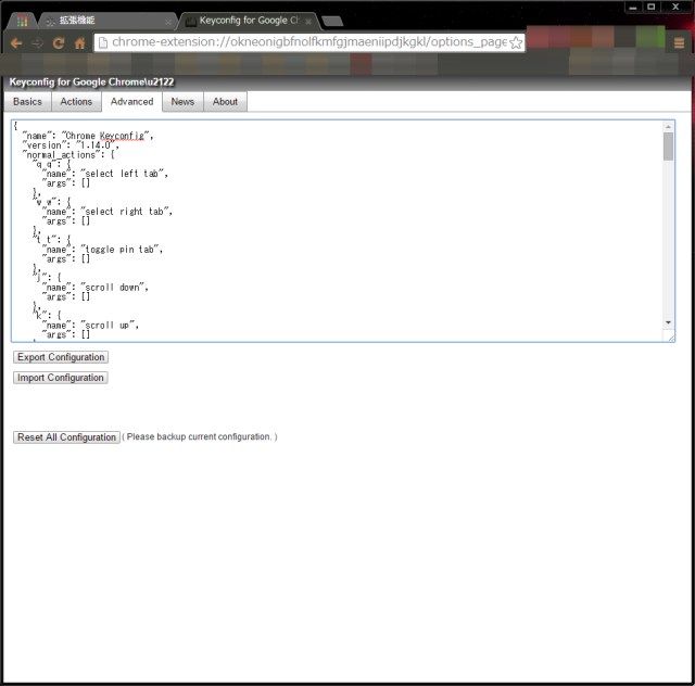 今回は、「KeyConfig」のみ設定のバックアップを行いました。他の拡張機能は設定が消えてもよいものや、再設定項目が少なかったので手間を省くために省略です。
