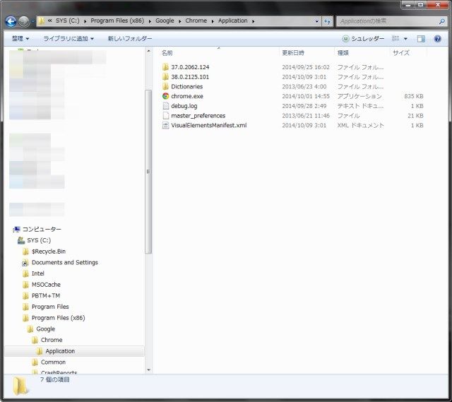 Chromeフォルダの容量を確認したところ。結構サイズがありますが、アップデート時の旧バージョンのファイルが残っているので、その分が占めていることになります。
