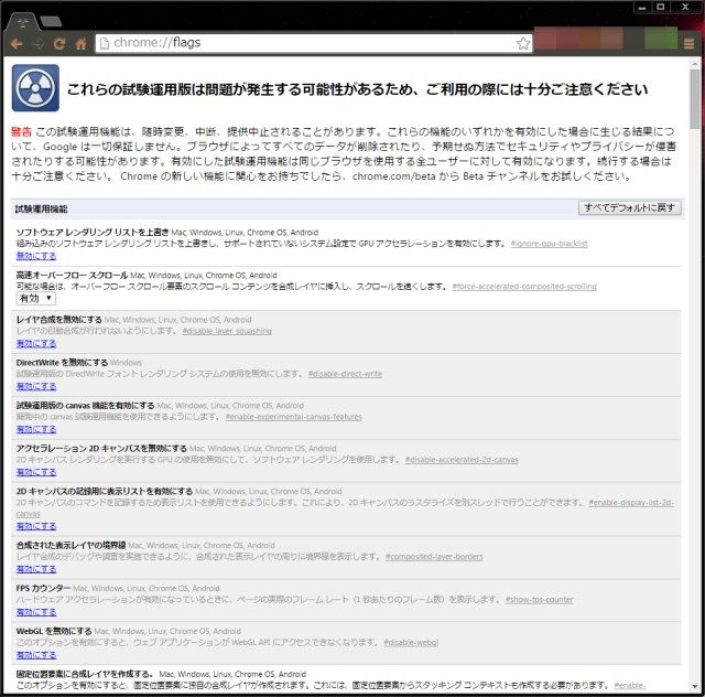 chrome://flagsから変更点を確認して記録しておく