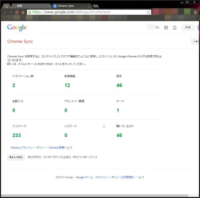 先の設定画面に「Googleダッシュボード」へのリンクがありましたが、これをクリックするとChrome Syncにて同期された項目の数が表示されます。