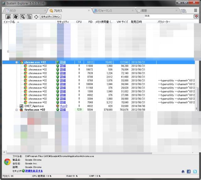 また、chrome.exe *32のように32ビットのイメージが動作していることが判ります。