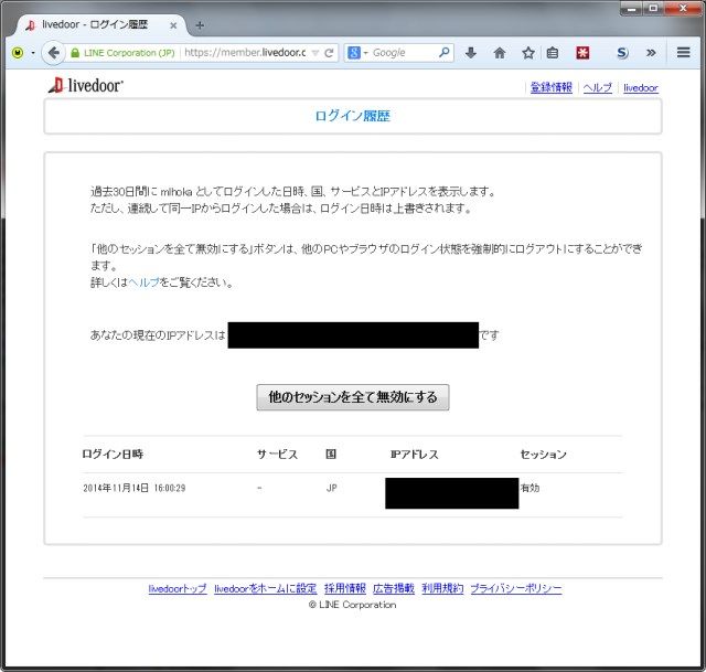 黒く塗りつぶしていますが、今現在アクセスしている端末(通常はルータ)のIPアドレスとホスト名が表示されています。下段の一覧には、過去のログイン日時およびIPアドレスが同様に表示されていますので、あまりにもIPアドレスが異なるホストからのアクセスがあった場合は盗用され可能性もあります(ただ、プロバイダやルータの再起動によってIPアドレスが変更されることがあるので参考程度にしかなりませんが)。