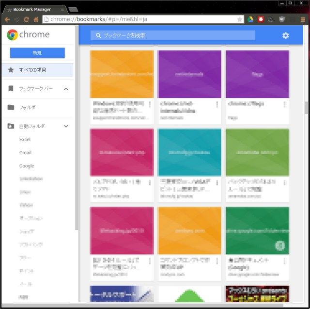執筆時点の最新バージョンChrome42ですが、ブックマークマネージャが刷新され、タイル状に管理することになりました。