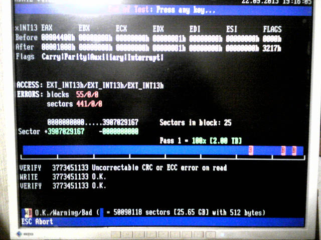 中断より少し下に表示されているバーに「B」と表示されている箇所が読み取りエラーがあったセクタの場所です。今回は441セクタにエラーがあったということになります。