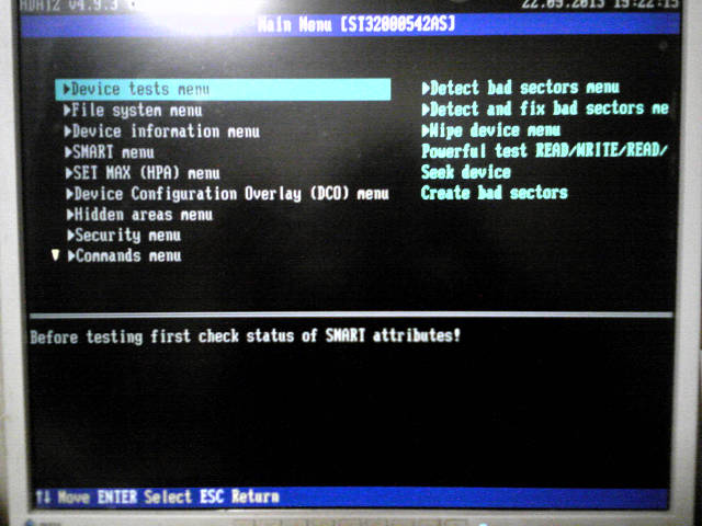 次にメインメニューが表示されるので「Device tests menue」を選択します。